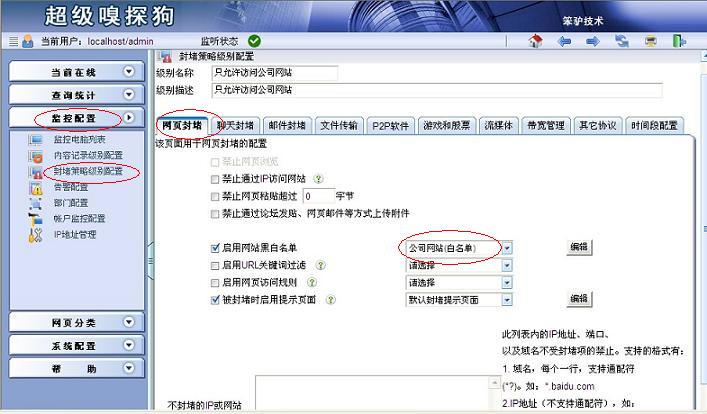 網(wǎng)絡(luò)管理者通過設(shè)置超級嗅探狗的網(wǎng)站白名單功能,將所被允許的網(wǎng)站名單添加到白名單中,設(shè)置成功后被監(jiān)控電腦只能訪問允許的網(wǎng)站,這樣不僅可以滿足企業(yè)正常的工作需要,還大大提高了員工的工作效率,下面將介紹具體操作步驟。