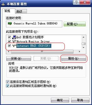 2. 選中“Internet協(xié)議(TCP/IP)”,點擊“屬性”按鈕,彈出“Internet協(xié)議(TCP/IP)屬性”對話框。