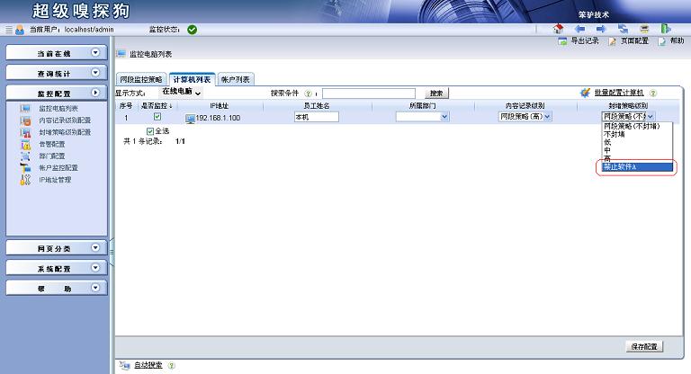 進(jìn)入監(jiān)控配置 -> 監(jiān)控電腦列表。對需要禁止的電腦進(jìn)行配置,選擇“封堵策略級別”為“禁止軟件A”,最后保存配置并應(yīng)用新配置。這時(shí)軟件A就無法通過TCP端口4902進(jìn)行通訊了,也就代表該軟件已經(jīng)被封堵成功。