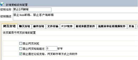 首先,我們需要先新增一個(gè)封堵策略級(jí)別.選擇"監(jiān)控配置"->"封堵策略級(jí)別配置",點(diǎn)擊"新增級(jí)別"可以打開封堵級(jí)別配置頁(yè)面.輸入名稱,描述,對(duì)于web郵件只需在"禁止通過(guò)論壇發(fā)貼、網(wǎng)頁(yè)郵件等方式上傳附件"前打勾即可.如圖: