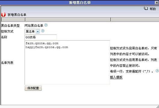 1. 在“監(jiān)控配置 -> 黑白名單配置”新增一個屏蔽QQ農(nóng)場的網(wǎng)站黑名單,如下圖所示: