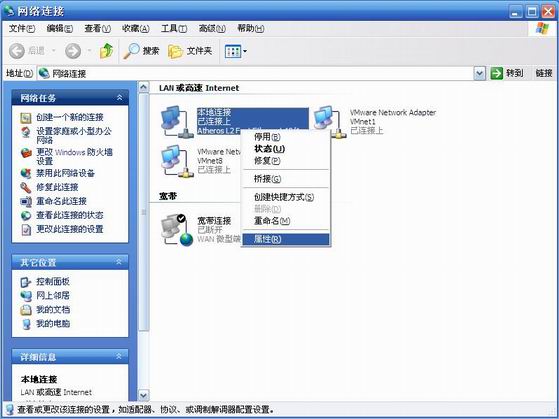首先,在“開始菜單”—“設(shè)置”中,打開網(wǎng)絡(luò)連接面板,右擊“本地連接”,選擇屬性。
