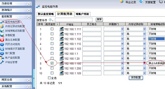 2.3 在“監(jiān)控配置->監(jiān)控電腦列表”里,選擇要封堵的主機(jī)和策略,保存配置,應(yīng)用封堵策略,如下圖所示: