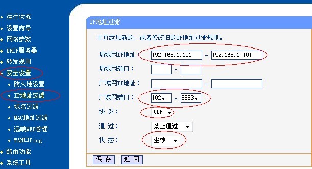 2.1 配置路由器,封堵UDP端口1024-65534。打開“安全設(shè)置->IP地址過濾”,新增規(guī)則,如下圖所示: