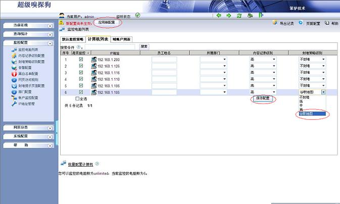 3.在“監(jiān)控配置-- >監(jiān)控電腦列表”中應(yīng)用封堵策略,如下圖所示: