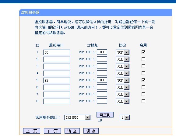 端口映射在TP-Link里叫虛擬服務(wù)器,如下圖所示:訪問(wèn)路由器的80端口就可以自動(dòng)轉(zhuǎn)發(fā)到內(nèi)IP192.168.1.103的80端口。