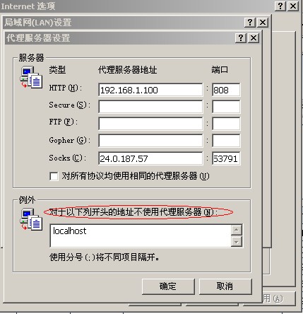 超級嗅探狗默認(rèn)打開的地址是localhost:9090,如果瀏覽器的配置是代理服務(wù)器模式,那么要把localhost加到“對以下列開頭的地址不使用代理服務(wù)器”里面去(如下圖所示)。否則就會去連接代理服務(wù)器的localhost,從而導(dǎo)致連接不上。