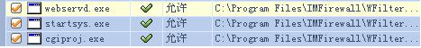 如下圖所示,分別將安裝目錄下的startsys.exe、webservd.exe、www/cgi-bin/cgiproj.exe設(shè)置為放行。