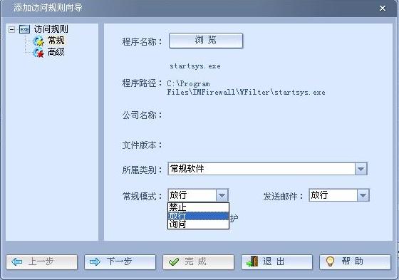 如上圖所示,以設(shè)置startsys.exe為例:點擊“添加規(guī)則”,點擊“瀏覽”,在安裝目錄(默認(rèn)安裝目錄C:\Program Files\IMFirewall\WFilter)下選擇startsys.exe, 在“常規(guī)模式”中選擇“放行”,點擊“下一步”,點擊“確定”。
