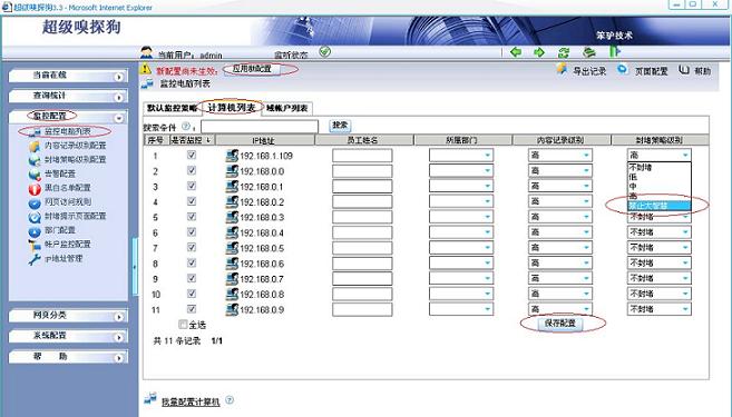 2. 在“監(jiān)控配置-- >監(jiān)控電腦列表-- >計算機(jī)列表”中應(yīng)用封堵規(guī)則,如下圖所示: