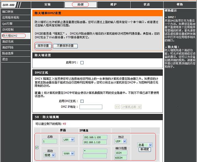 1. 首先登陸路由器,在“高級(jí)- - >防火墻&DMZ”里面對(duì)防火墻進(jìn)行設(shè)置,具體設(shè)置如下圖所示: