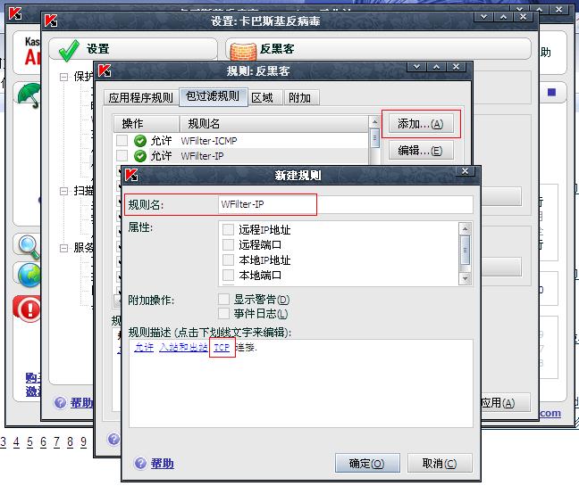 2. 點擊“添加”按鈕,新增規(guī)則“WFilter-IP”;點擊“規(guī)則描述”欄的“TCP”進(jìn)入選擇協(xié)議