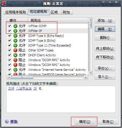 4. 參照之前的第2,3步驟將規(guī)則“WFilter-ICMP”添加,并將兩個規(guī)則勾選后點擊“確認(rèn)”按鈕