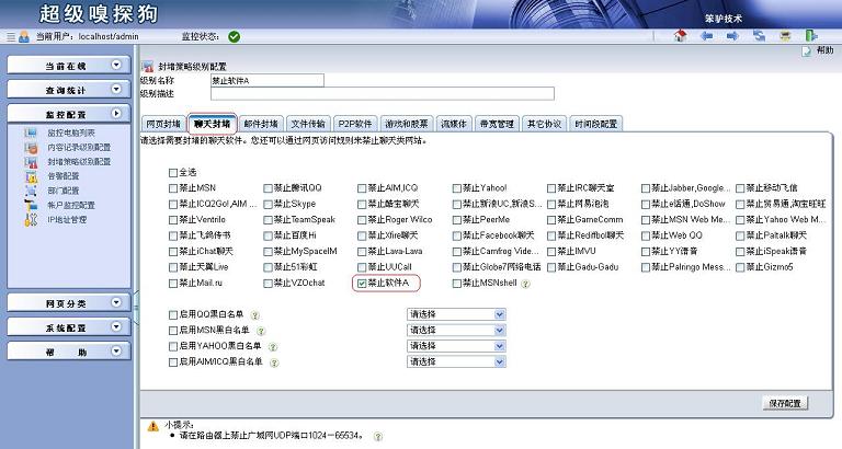 進(jìn)入監(jiān)控配置 -> 監(jiān)控電腦列表。對需要禁止的電腦進(jìn)行配置,選擇“封堵策略級別”為“禁止軟件A”,最后保存配置并應(yīng)用新配置。這時(shí)軟件A就無法通過TCP端口4902進(jìn)行通訊了,也就代表該軟件已經(jīng)被封堵成功。