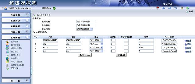 1)類型:TCP SEND 格式:0 Patten內(nèi)容:^\x10\x00\x00\x00\xe5\xd9\x27\x4c 2)類型:UDP ALL 格式:0 Patten內(nèi)容:^[\x12\x13]\x27\x00\x00[\x00-\xff]{3}\x00$ 3)類型:HTTP SEND 格式:Host Patten內(nèi)容:.*jsq\.(xunlei|gigaget)\.com 4)類型:TCP SEND 格式:0 Patten內(nèi)容:.*request.*userid.*peerid.* 其他相關(guān)信息可隨意填寫,但要注意Patten內(nèi)容一定不能書寫錯(cuò)誤。最后保存配置。3.添加相應(yīng)的封堵策略