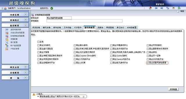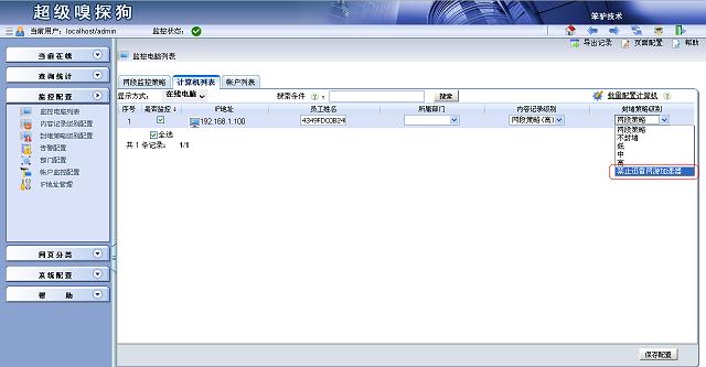 進(jìn)入監(jiān)控配置 -> 監(jiān)控電腦列表。對(duì)需要禁止的電腦進(jìn)行配置,選擇“封堵策略級(jí)別”為“禁止迅雷網(wǎng)游加速器”,最后保存配置并應(yīng)用新配置。這時(shí)迅雷網(wǎng)游加速器就無(wú)法為任何網(wǎng)游加速了,也就代表該軟件已經(jīng)被封堵成功。再把想要封堵的網(wǎng)游加入到封堵策略就可以了。