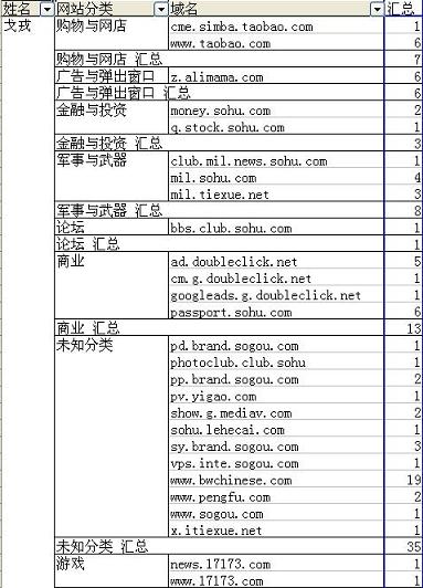 步驟4:將右邊數(shù)據(jù)透視表字段列表中的字段(姓名、網(wǎng)站分類、域名)雙擊添加,并把“訪問次數(shù)”在下拉列表中選擇添加到“數(shù)據(jù)域”,在左邊的區(qū)域中將會顯示統(tǒng)計(jì)后的結(jié)果。具體結(jié)果如下圖所示: