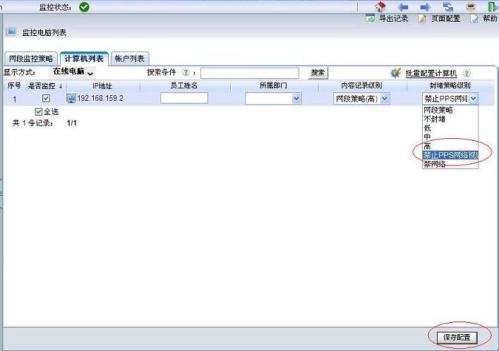 2.在“監(jiān)控電腦列表”中配置你想禁止的移動(dòng)設(shè)備的IP策略為“禁止PPS”,保存設(shè)置,應(yīng)用新配置。