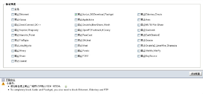 選中禁止XunLei,QQDownload,Flashget,根據小提示想要完全禁止迅雷還需要禁止BT以及FTP協議。