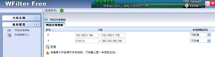 進入到監(jiān)控配置 -- 網段封堵策略,點擊新增,輸入想要封堵的網段如:192.168.1.166-192.168.1.170 。