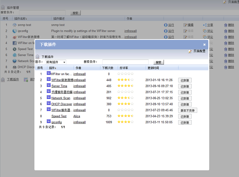 該插件系統(tǒng)提供了網(wǎng)絡(luò)管理、上網(wǎng)行為管理的一系列插件,如:網(wǎng)絡(luò)掃描、代理服務(wù)器掃描、DHCP掃描、WFilter服務(wù)器管理等多種插件。而且插件還在不斷的豐富中,您也可以開(kāi)發(fā)自己需要的插件。