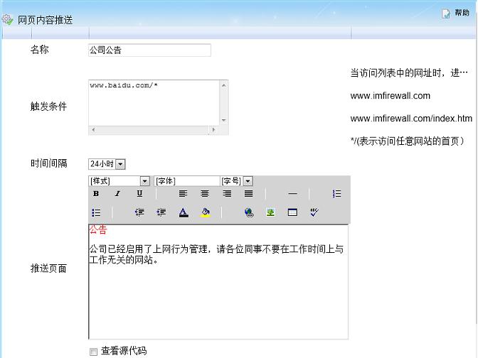 該功能可以指定條件給客戶機(jī)推送web頁(yè)面,可以用于企業(yè)公告、內(nèi)容推送、報(bào)表推送等功能的實(shí)現(xiàn)。