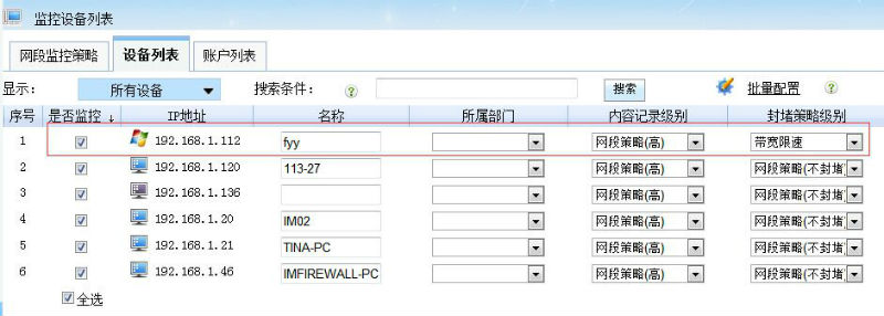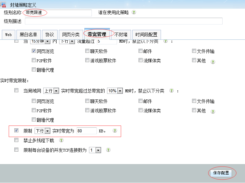 4.在“監(jiān)控配置-封堵策略級別配置”中新增封堵策略級別。輸入名稱,在帶寬管理選項卡中,對下載實時帶寬進行限制,如下圖所示:
