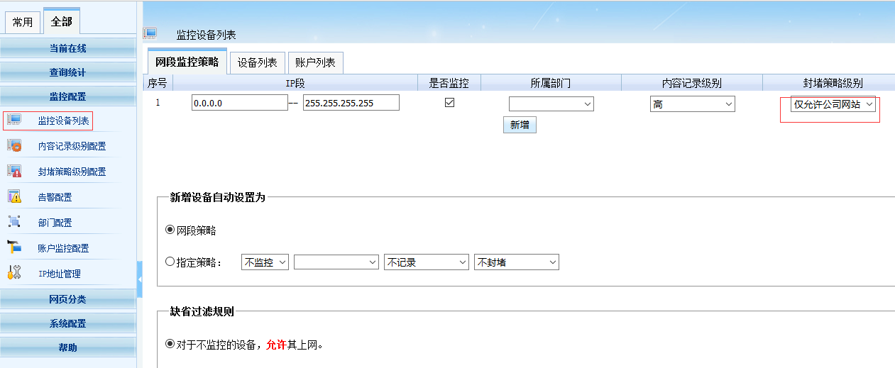 1. 在“監(jiān)控設(shè)備列表”的“設(shè)備列表”中,給每個設(shè)備設(shè)置一個比較嚴(yán)格的策略。