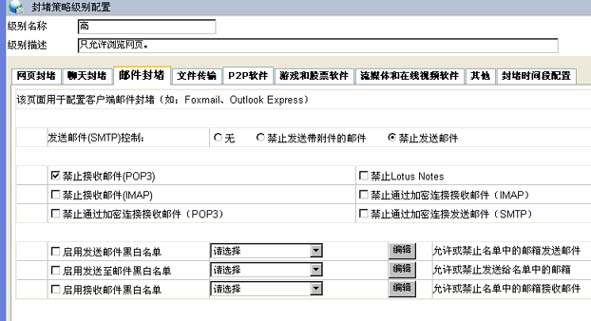 對(duì)于客戶端郵件,可以選擇"郵件封堵"標(biāo)簽,具體可以配置禁止收發(fā)以及黑白名單過(guò)濾(參考網(wǎng)站黑白名單配置用例)等.如圖: