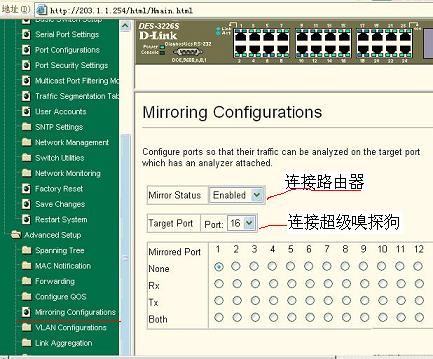如圖所示,只需要把路由器端口(端口1)做為鏡像的源端口, 超級嗅探狗(端口16)做為目的端口即可。