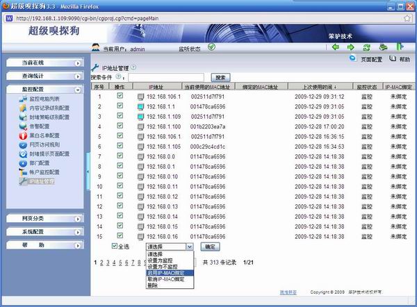 在超級嗅探狗的“監(jiān)控配置”->“IP地址管理”頁面,勾選您需要綁定的電腦,點擊下拉菜單的“啟用IP-MAC綁定”,再點擊確認,應(yīng)用新配置,就可以輕松實現(xiàn)綁定。2. IP-MAC綁定后的效果