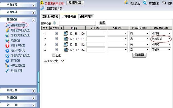 2.3 在“監(jiān)控配置->監(jiān)控電腦列表”里,選中要封堵的主機(jī)和封堵策略級(jí)別,保存配置并應(yīng)用封堵策略,如下圖所示: