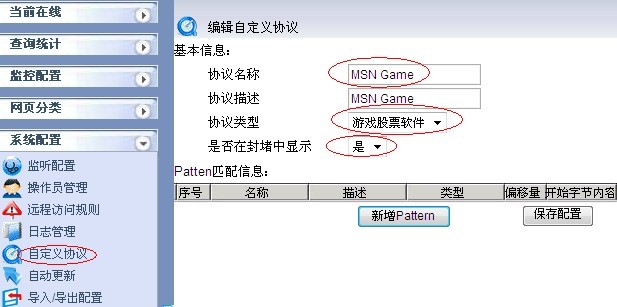2.1 在“系統(tǒng)配置->自定義協(xié)議”中點(diǎn)擊“ 新增自定義協(xié)議”增加一個(gè)自定義協(xié)議,命名為MSN Games,協(xié)議類(lèi)型選擇“游戲股票軟件”,如下圖所示:
