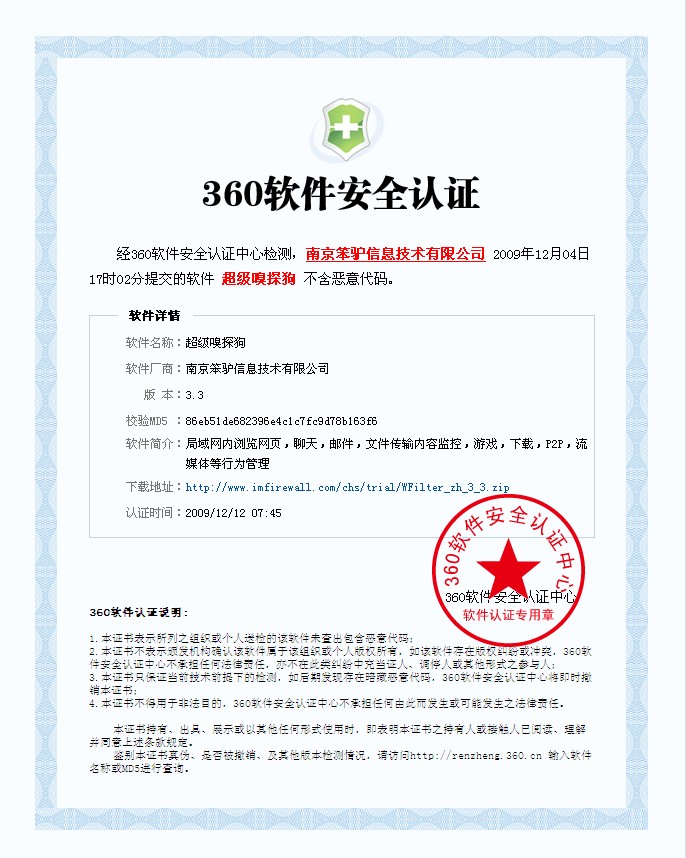 通過該認(rèn)證表明WFilter(超級嗅探狗)是不含有“惡意代碼”的網(wǎng)絡(luò)監(jiān)控軟件,讓網(wǎng)民能夠信任開發(fā)者及其軟件,更容易找到優(yōu)秀的軟件,不再為其功能而放棄安全性。