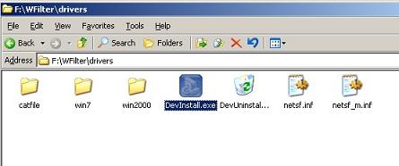 - In "drivers" directory of WFilter, you can find an exe file named "DevInstall.exe". Double click this file to launch it.