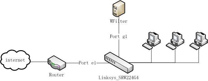 As in the diagram above, port "e1" is connected to the internet router and port "g1" is connected to the WFilter computer.