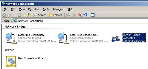 - Open the Network Connections folder. Hold down the Ctrl key while clicking the two local connections, then right click one of them and select Bridge Connections.